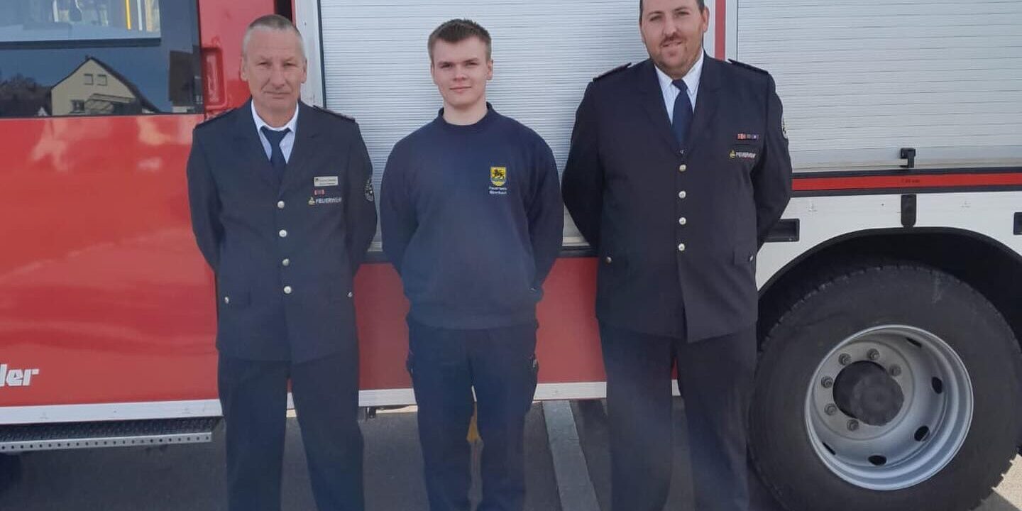 v.l.r: Kommandant Michael Fleischer, Tim Stumpf, stellv. Kommandant Steffen Mratzek